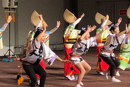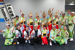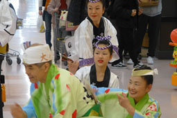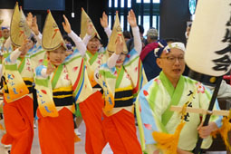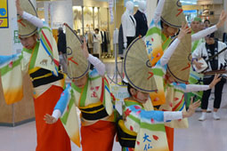 | | 11:30〜と13:30〜の2回の阿波おどりは店内での披露となりました。組踊りの回りには多くの見物客の輪ができて各種喝采。続いて店内をパレードして、徳島をPRしました。
