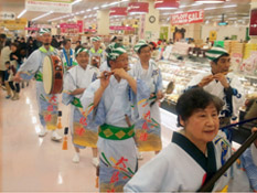 パレード、スーパー近商の店内を練り踊り、最後は広場ステージで披露。