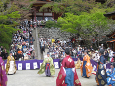 | 4月 | 29日(金) | 「大化の改新」ゆかりの桜井市多武峰の談山神社「春のけまり祭」で阿波踊りを奉納しました。長岡千尋宮司が徳島県人というご縁で実現しました。このあと桜井市内の商店街の活性化と東日本大震災の復興祈願のためのイベントに参加。最終の桜井駅前では義援金を呼びかける地元の高校生、観光協会関係者それにこの日の祈願祭の斎主を務めた佐藤静・等彌神社宮司なども一緒に踊りの輪が広がりました。 |