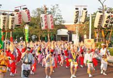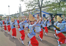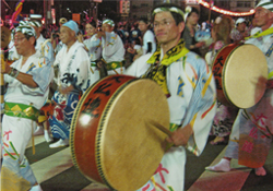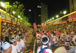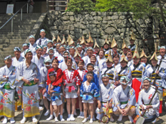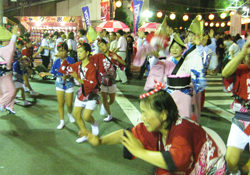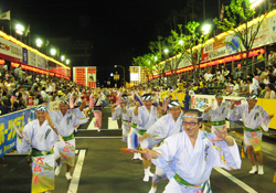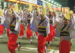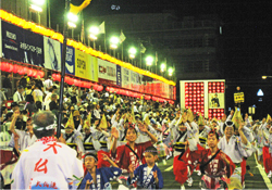 | | 毎年恒例となった徳島での阿波踊り「里帰り」。今年は「南大阪連」や「にしき連」との総勢約100名にのぼる合同チームで参加しました。午後7時40分過ぎ、徳島市役所前演舞場をスタート、次いで藍場浜演舞場と“さじき席”で堂々の踊り込みです。
