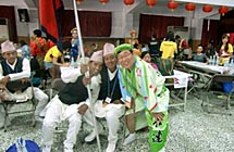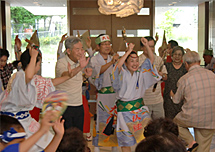 | | 前半は車椅子の老人対象、後半はお元気なお年寄りと二部構成で大幅に予定時間を超過し齢と時間を忘れるほど、鉦や太鼓に大勢が挑戦し男も女も阿波踊りの楽しさを満喫する一日でした。