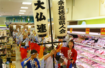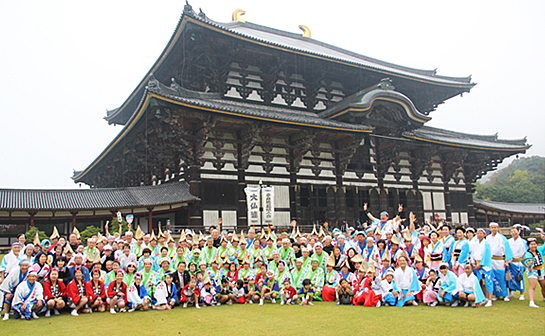 | | 「奈良県南部災害復興祈願奉納阿波踊り」が今年も東大寺で開催されました。大仏連のほかに「関西阿波おどり協会」の「南大阪連」「にしき連」「なにわ連」「京都楽酔連」「播磨めちゃらく連」「ちるど蓮」の6連が特別参加、170名が踊りました。