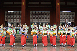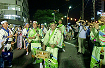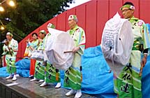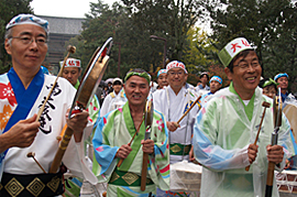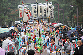 | | 南大門からスタートしたパレードの後は中門前で各連の組踊りが。ボランティアスタッフらが募金箱をもって回ると大勢の参拝者から義援金が寄せられました。