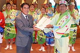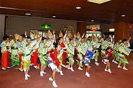 | | 12月6日には大仏連のメンバー37名が十津川村を訪問して、更谷慈禧村長に義援金を手渡しました。午後3時からは約50名の村民の皆様も会場の「ホテル昴」を訪れ、ホテルのロビーで阿波踊りを鑑賞、最後はみんな一緒に踊りました。