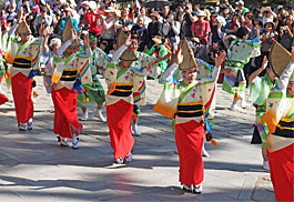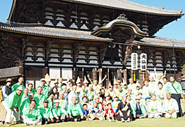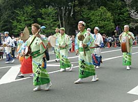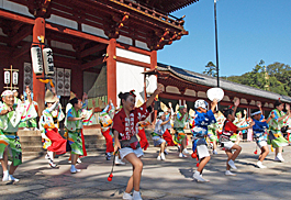 | | この日出演したのはなにわ連、播磨めちゃらく連、神戸楠公連、雪連、にしき連、城東連、めちゃらく連、ちるど連のほか地元の大仏連ら200名。午後1時に南大門をパレードがスタート。中門前広場ではそれぞれの連が組み踊を披露しました。
