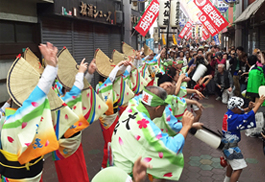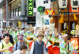 | | 関西阿波踊り協会主催の東成玉手箱商店街でのパレード踊りの依頼です。今回参加者は大仏連の32名のみ。商店街のはしから端まで、本当に1キロ近いパレード。途中で組踊や総踊りも披露。みなさん喜んでくれました。