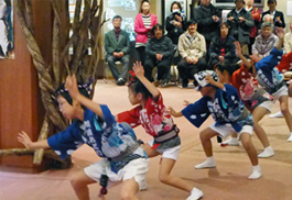 ロビーには一般村民もたくさん詰めかけ、大きな拍手が沸き起こりました。その後は、阿波踊りを披露、村民のみなさんと交流のひとときとなり、大いに盛り上がりました。