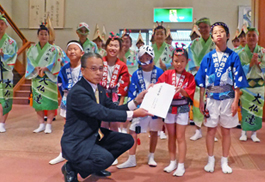| | 午後3時から十津川温泉郷にある「ホテル昴」のロビーで贈呈式。大仏連のちびっ子たちから役場の東武総務課長に手渡されました。