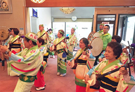 | | 初めての出演依頼です。まだ新しい施設。2階の集会室で約30分。30名の参加で顔見世から、子供踊り、組踊し、最後の総踊りまでフルエントリー。入所者の笑顔が忘れられない1日でした。