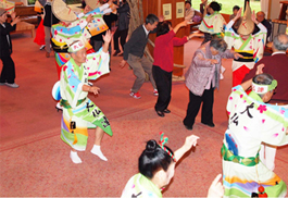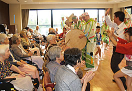 前半は車椅子の老人対象、後半はお元気なお年寄りと二部構成で大幅に予定時間を超過しました。一緒に踊りの輪に入る人や、鉦や太鼓の演奏に挑戦する人たちで1階のロビーは交流の場となりました。