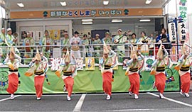 | | 22日は、「アピタ大和郡山店」。キャンペーントラック前の広場では阿波踊りを楽しみにきたという買い物客も。2回の特設広場では大勢の観客が熱心に拍手を送ってくれました。