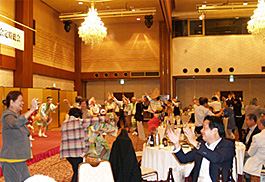 | | 阿波踊り「大仏連」の忘年会が、奈良ロイヤルホテル「春日の間」で開かれました。31名が参加。長尾連長のあいさつと乾杯で宴会開始。4つのテーブルに分かれて談笑の輪が広がりました。