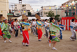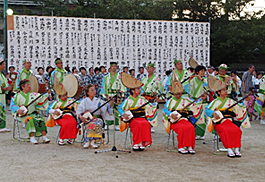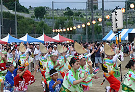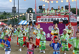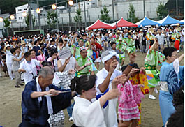 | | 王寺町の町政思考90年を記念して開かれた「町民盆踊り大会」に招かれて出演。会場は王寺健民運動場。中央にやぐらが組まれ鳴りものはステージの上に。阿波踊りが始まるとグラウンドには大きな踊りの輪が広がり、浴衣姿のにわか踊り子が大勢参加してくれました。