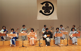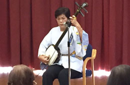 | この日は奈良徳島県人会の応援もあり、大倉元さんの軽妙なトークと手品が披露されました。また、日本民謡ひろみつ会家元・梅本昌子さんが津軽三味線の演奏。