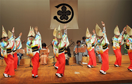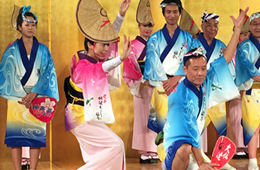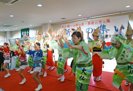 | ホテルニューオオタニ大阪で開催されました。約800名が参加した集いの締めくくりとして、今回初めて関西阿波踊り協会の選抜チームが登場しました。大仏連からは湯浅真太、岩本真紀のお二人が参加、見事な踊りを披露してくれました。