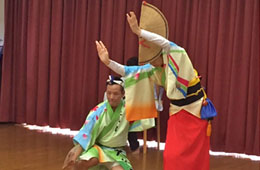 | 男女組踊りや子供踊りほかクジャク踊りも披露して、会場は和やかな雰囲気。 |