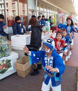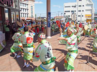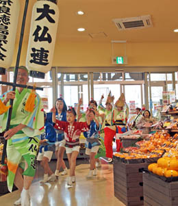 | | 1回目は不思議と雨も収まり全ての構成踊りができて、午後からは雨も強くなり店内パレードとなりましたが、買い物客には手拍子と笑顔で喜んでいただき、徳島新鮮野菜販売に一役買うことができました。