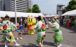 | | 11時からはメインステージで組み踊りを披露。午後からは徳島号の前で、総踊りなど徳島の食を一緒にPR。 |