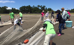 | | この日は午前7時に西大寺駅南口に集合。28人は一路徳島へ。午前11時に阿南到着。早速、中林海岸での「地引き網体験」。砂浜で「よいさー、エイサー」のかけ声とともに網を引くと、中には鯛やたこや穴子がわんさか。大漁だ。