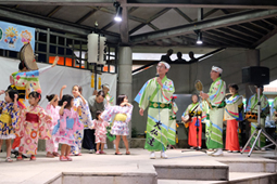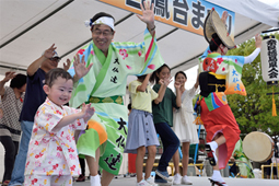 | | 組踊りの中で、参加者対象の阿波踊り教室。小さなお子さんがいっぱいステージに上がってくれました。最後は、広場に集まった観客のみなさんも一緒になっての総踊り。
