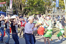 | | 阿波踊り教室も開催して、踊り方の指導。2回目の公演ではみんな一緒に輪を作っての総踊り。御祝いに訪れた大和郡山の上田清市長も飛び入りで参加、阿波踊りのPRと自身のフェイスブックにも紹介してくださいました。