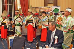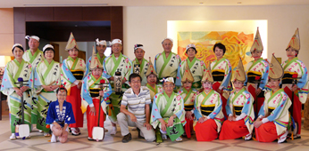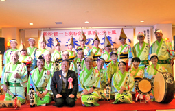 | | 大仏連も会員として32名が参加、総会のあとの懇親会の最後のイベントを努めました。会場は100人近くの徳島県人であふれかえり、組踊りのあとの総踊りでは、来賓や会員全員が参加、大きな輪になって会場が一つになって踊りました。