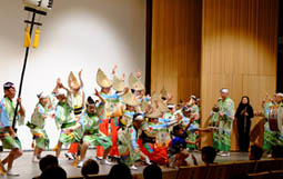 | | 終了後は、阿波踊り。フルート奏者の松村容子さんが「アジア初演から今年100年を迎える第九」を演奏し、このメロディーに合わせて踊りました。フィナーレの総踊りでは会場全体がぞめきのリズムで踊り出し、会場は徳島一色に包まれました。