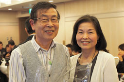 | | この日、長尾会長はご夫婦同伴で参加、2人から感謝の言葉が述べられました。この後、長尾、森両氏には花束が贈られました。また、会員の木内光幸さんが2012年からの長尾会長の勇姿を17分の動画と写真で披露、大きなスクリーンに懐かしのシーンが映し出されると拍手がわきました。