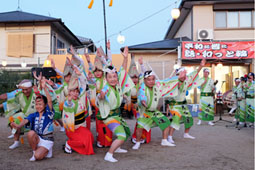 | | 前半は組踊り、後半は総踊りと、すっかりと地域の皆様に阿波踊りはお馴染みに。約30分の踊りを満喫していただきました。今年は8機の怪獣が展示され、子供達に大人気。阿波踊りも頑張りました。