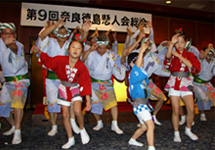 | | 「大仏連」の母体の第9回奈良徳島県人会の定期総会が開かれ、総会の締めくくりとして阿波踊りを披露。徳島県から里見光一郎副知事も参加、さすがは徳島県人の集まり。最後は会場全体が踊りの渦に。老いも若きも「踊らにゃ、そんそん」で大盛り上がり。