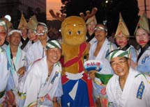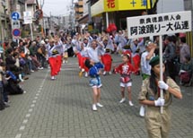 | 8月 | 12日(水) | 待ちに待った本場・徳島の阿波踊り。午後7時から市役所前、続いて藍場浜の2カ所の演舞場にて南大阪連と我が大仏連の「合同連」が練り踊りました。来年の「平城遷都1300年祭」のPRも兼ねて記念事業協会からマスコットキャラクターの「せんとくん」も応援に。おかげさまで翌日は新聞にも大きく取り上げられました。